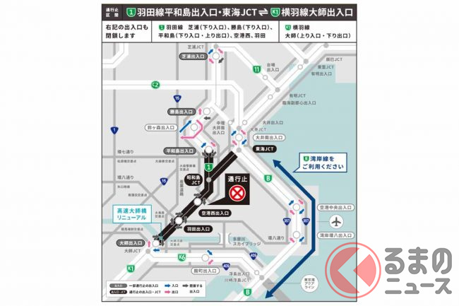 期間中は通行止め区間にある出入口に加え、区間外にある羽田線下りの芝浦入口と勝島入口も閉鎖されます。