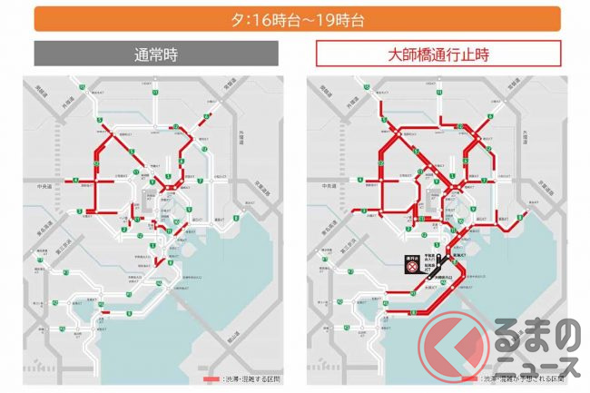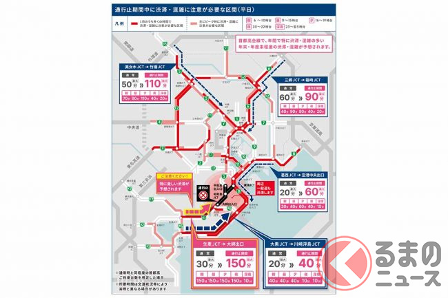 なかでも横羽線は激しい渋滞が予測されており、上りの生麦JCT→大師の最大所要時間(平日、以下同じ)は通常30分のところ、期間中は5倍の150分かかる見込みです。