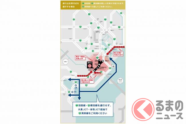 羽田線・横羽線の迂回ルートとなる湾岸線も大きく影響します。東行き(千葉方面)の大黒JCT→川崎浮島JCTは通常20分が、期間中は40分に。西行き(横浜方面)の葛西JCT→空港中央は通常20分が、期間中は60分になる見込みです。