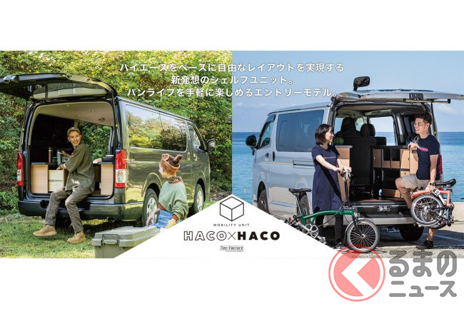 2023年5月8日、トヨタ「ハイエース」などをベースとしたキャンピングカーを製造・販売するトイファクトリーは、同社のラインナップするシェルフユニット「HACO×HACO(ハコハコ)」について、ユーザーがより簡単に選べる3つのパッケージを新設定するとともにWEBサイトを大幅リニューアル。活用事例を紹介するコンテンツを公開しました。
