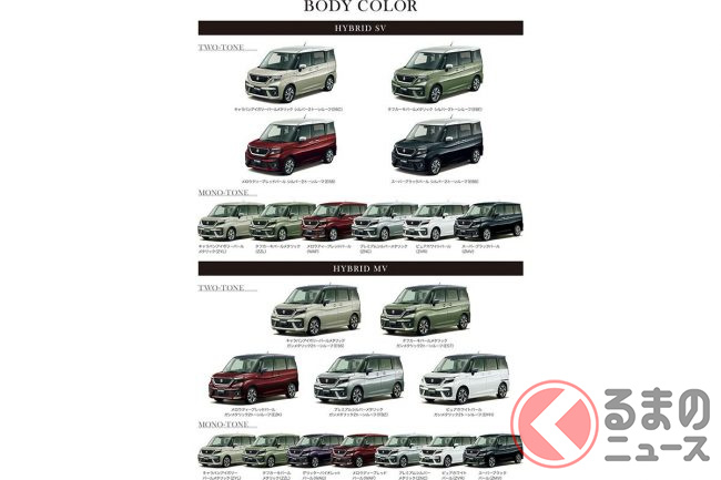 ボディカラーは、ソリオ HYBRID SZとソリオ バンディット HYBRID SVのみに設定していた「キャラバンアイボリーパールメタリック」と「タフカーキパールメタリック」を全グレードに採用し、カラーラインアップの一部変更も行っています。