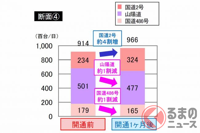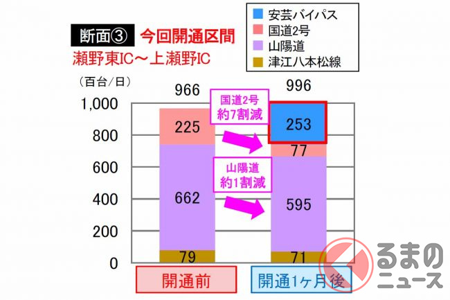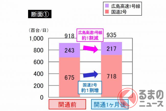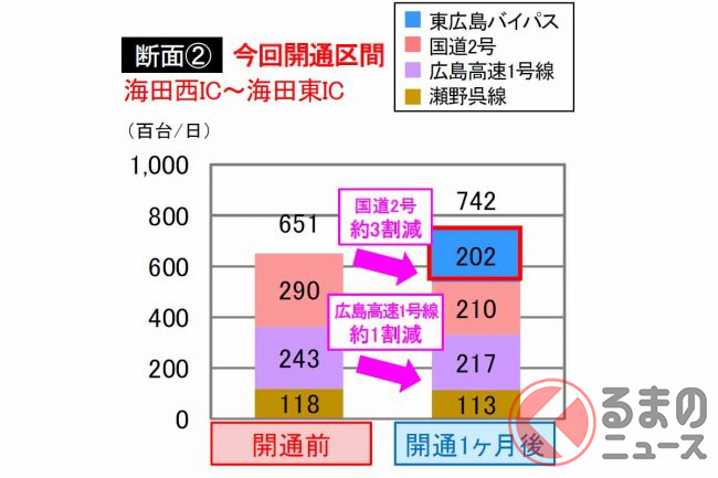並行する国道2号の交通量は3~7割ほど減少し、周辺の広島高速1号線や山陽道などからも東広島・安芸バイパスへ交通が転換しているといいます。