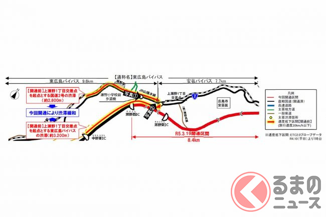 この開通により国道2号の新広島・東広島・安芸・西条・田万里の各バイパスが1本につながり、広島市街から東広島市や広島空港方面のアクセス性が向上。