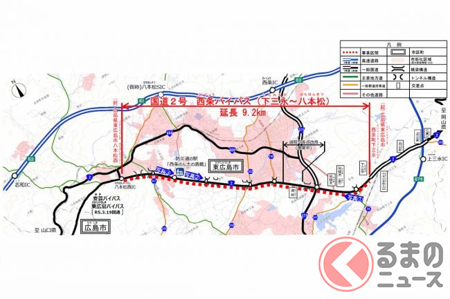 なお、今回の開通区間に接続する西条バイパスについては、暫定2車線の下三永~八本松間9.2kmを4車化する事業が2023年度に始まりました。
