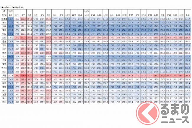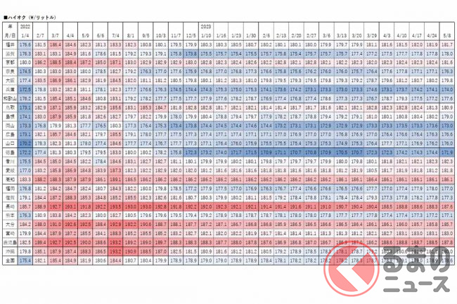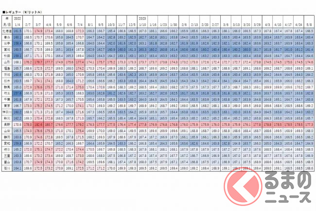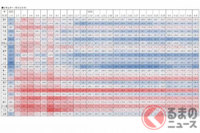 経済産業省資源エネルギー庁は2023年5月10日、レギュラーガソリンの8日時点の店頭小売価格(消費税込)を発表しました。