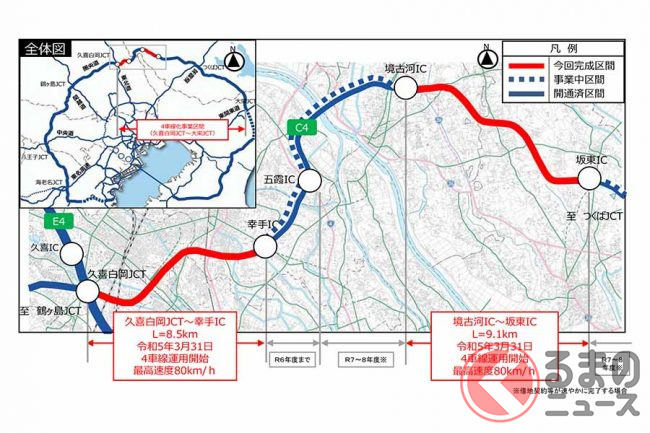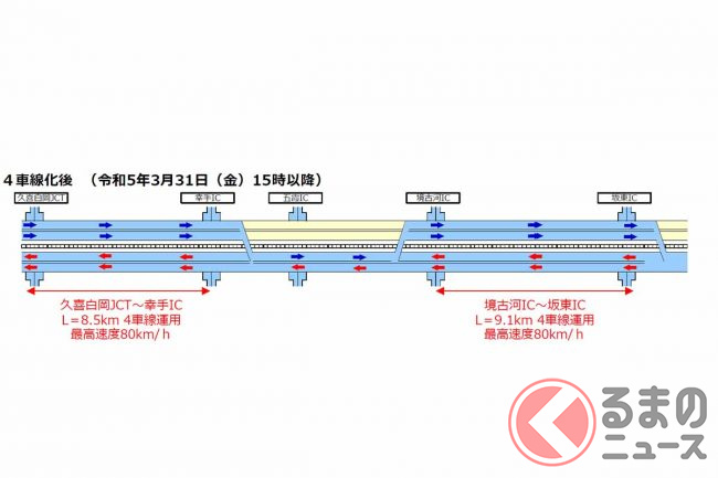 4車線化は3月31日、埼玉県内の久喜白岡JCT~幸手IC間8.5kmと、茨城県内の境古河IC~坂東IC間9.1kmで実現。同時に、70km/hだった最高速度は80km/hに引き上げられました。