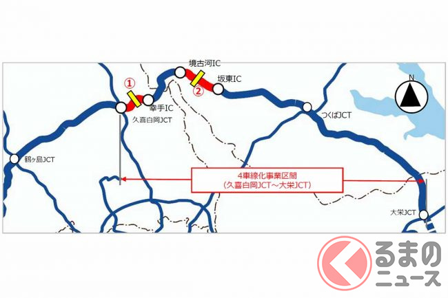 幸手IC~五霞IC間は「2024年度まで」、五霞IC~境古河IC間は「2025~26年度」にそれぞれ4車線化される見通しです。