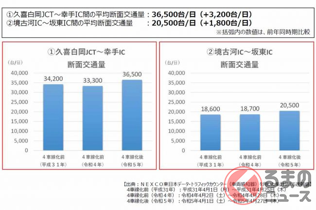 4車線化後の1日あたりの交通量は、久喜白岡JCT~幸手IC間が3万6500台(前年同時期比3200台増)、境古河IC~坂東IC間が2万500台(同1800台増)ということです。
