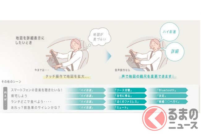 ドライバーの安心・安全な運転をサポートする機能として「音声操作」に対応し、ハンドルから手を離さず、ドライブ中に便利なナビ機能やエンターテインメント機能を声で操作することが可能になったといいます。「ハイ彩速」と声をかけてナビを操作でき、全108操作、242ワードに対応となっています。