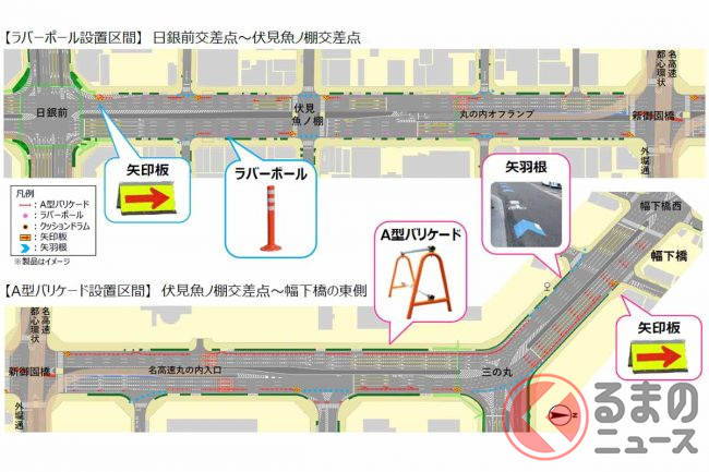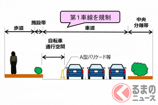 実験では、車道片道4車線のうち第1車線と第2車線の間にバリケードやラバーポールなどを置き、自転車レーンを確保します。自転車は、各種標識や路面の青い矢羽根に従いそのレーンを走ります。車道は期間中、3車線に減ります。