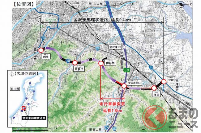 さらにこのうち今町~鈴見台間9.4kmは国道159号「金沢東部環状道路」にも指定されており、のと里山海道、国道8号・159号「津幡バイパス」、北陸道(新潟・富山方面)から市中心部へ向かう際の主要ルートの1つにもなっています。