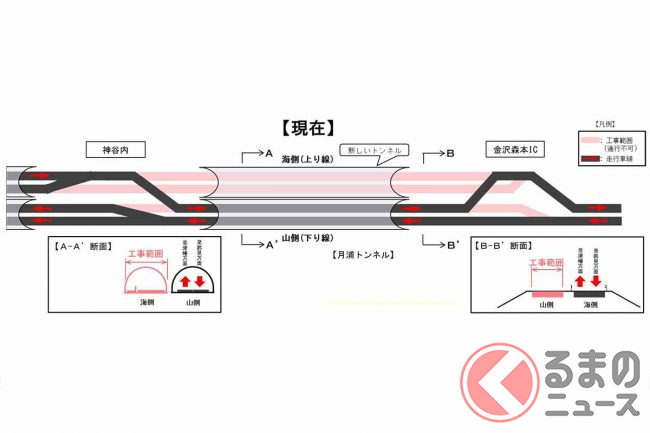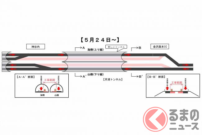 「北陸道~金沢市街」ルートの混雑緩和なるか 「山側環状」の4車線化が進行中 24日から月浦トンネルで上下線分離