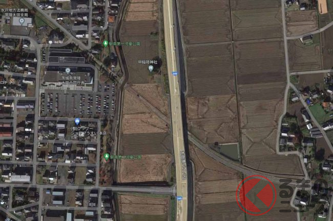 今回開通するのは、茨城県の常陸太田合同庁舎付近から国道349号までの273mです。2016年度に事業着手され、幅5mの道路として整備されます。終点は、高架の国道をくぐる形となり、市道はそのまま里川の方へつながります。