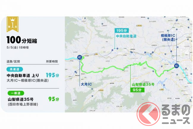 ・1位:【100分短縮】5日18時頃、高速:中央道大月→圏央道相模原195分/一般道:山梨県道35号経由95分