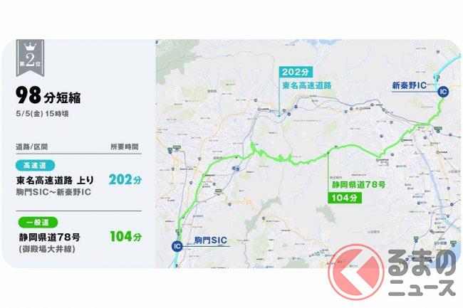 ・2位:【98分短縮】5日15時頃、高速:東名駒門→新東名新秦野202分/一般道:静岡県道78号経由104分