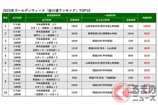 これは、2023年GW後半の5月3日から7日までの、ナビタイムジャパンが提供しているカーナビアプリのプローブ情報(走行実績)を分析し、高速道路をそのまま走行した場合と、高速道路を一度降りて一般道を走った場合を比較し、短縮できた時間順に並べたものです。