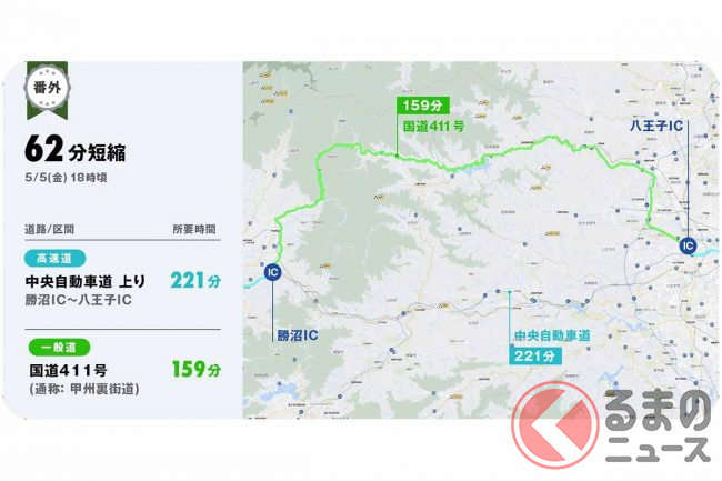 5月5日18時頃の場合、所要時間は中央道・勝沼IC→八王子ICの221分に対し、国道411号経由は159分だったといいます。
