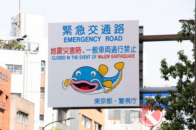 このように予測不可能な大規模な震災が起こっても、人命救助や緊急物資輸送に備える意味として、ナマズの標識が設置されています。