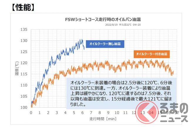 同社によると、富士スピードウェイでのサーキット走行テストでは、オイルクーラー未装着の場合は2.5分後にオイル油温が120℃を超え、6分後には130℃に到達、エンジンオイルの保護性能が十分に保たれない温度となりましたが、このオイルクーラーを装着した場合は油温の上昇が穏やかになり、120℃に達したのは7.5分後、以降も油温が安定した状態が続き、15分経過後も最大121℃までの上昇にとどまったそうです。