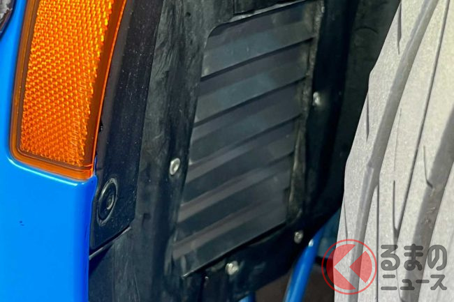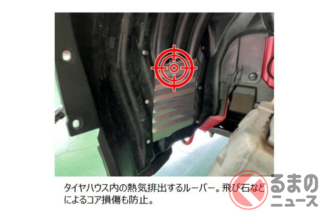 インナーフェンダーにはプレス成形のルーバーも取り付けられ、冷却コアからの排熱の整流効果はもちろん、飛び石などによる冷却コアの損傷も防げるよう工夫されているといいます。