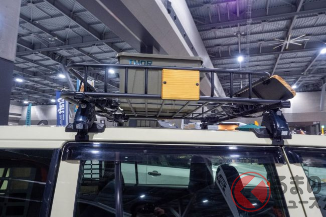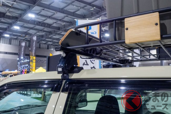 屋根に目を向けると、こちらにはオリジナルのウッドパネル(2万1780円)が付いたルーフラックがあります。そのままだとちょっとゴツゴツとした印象のルーフラックですが、木目のカラーがワンポイント入ることで、かなり印象が変わってきます。