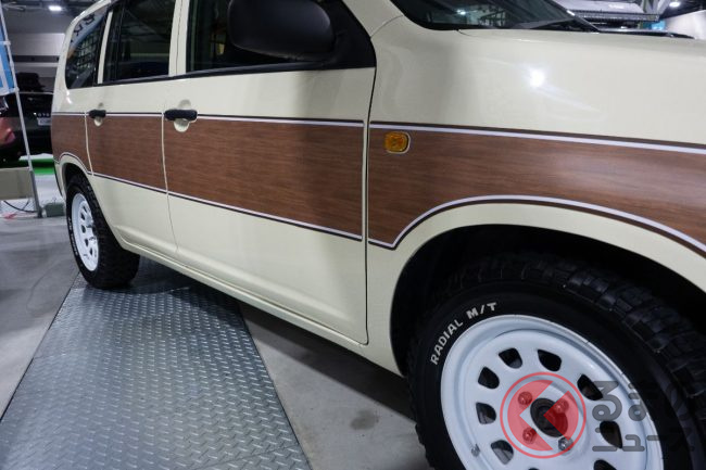 今回のクリーム色のプロボックスにもさまざまなパーツが取り付けられています。特にイチオシしていたのが、車両側面に付いているオリジナルのマグネットウッドデカール(税込8万8000円)です。