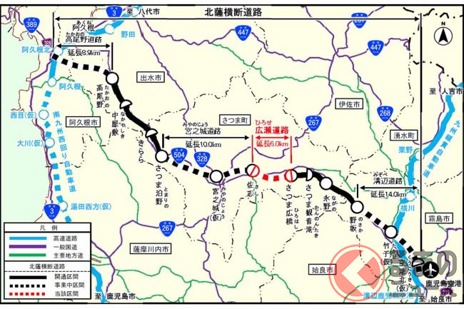 北薩横断道路は鹿児島空港(霧島市)を起点とし、さつま町、出水市を経て、南九州道の阿久根北IC付近(阿久根市)に至る延長約70kmの地域高規格道路です。