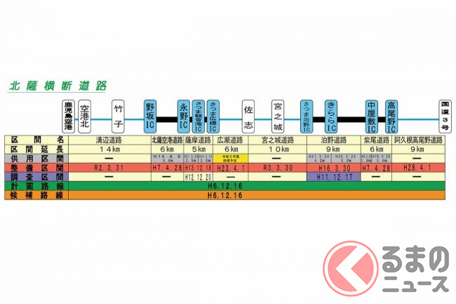なお、未開通の空港~野坂IC間14km(溝辺道路)、佐志IC~さつま泊野IC間10km(宮之城道路)、高尾野IC~阿久根北IC付近(国道3号)間9km(阿久根高尾野道路)の3区間については、いずれも事業が進行中です。