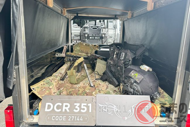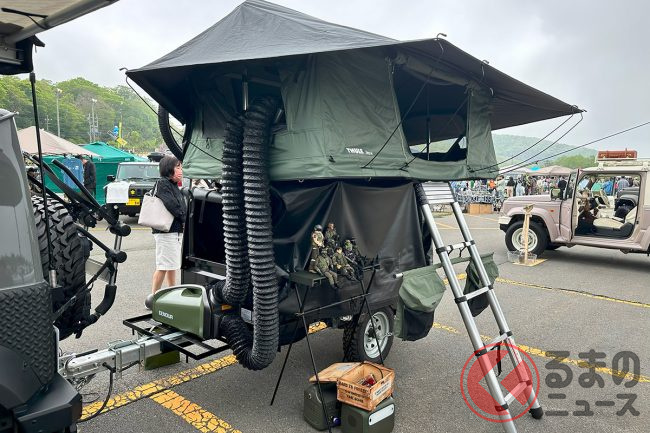 無線が趣味とのことで、各部に付けられたリグやアンテナも“らしい” 雰囲気作りに貢献していますが、驚かされたのが牽引しているトレーラー。