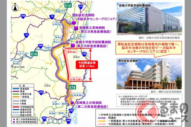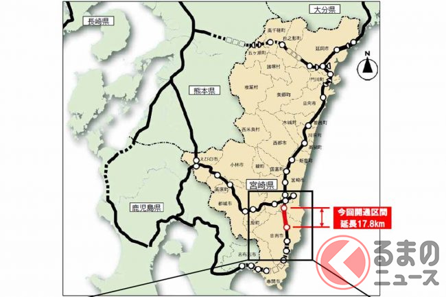 今回は、宮崎県内の清武南IC~日南北郷IC間17.8kmが3月25日に無料の自動車専用道路として開通。これにより、すでに開通していた日南北郷IC~日南東郷IC間とつながり、宮崎道や宮崎市から日南市までが東九州道で直結しました。