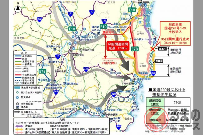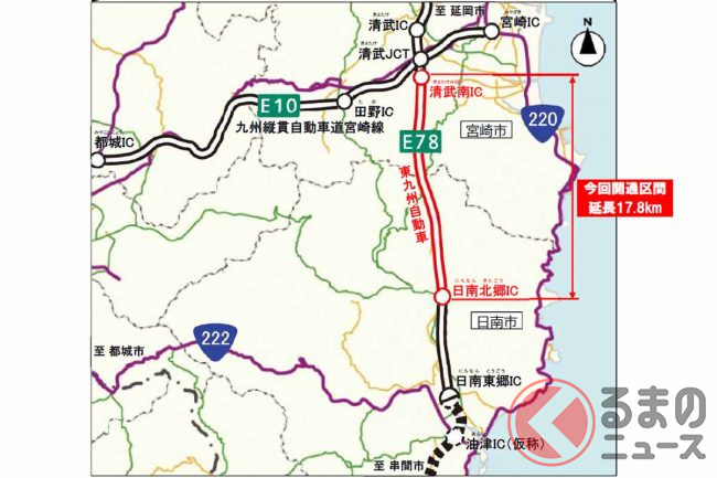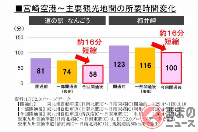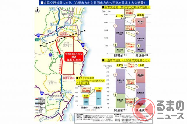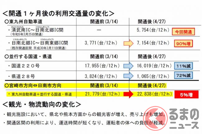 国土交通省九州地方整備局宮崎河川国道事務所は2023年6月5日、東九州道・清武南IC~日南北郷IC間の開通1か月後の交通状況を発表しました。