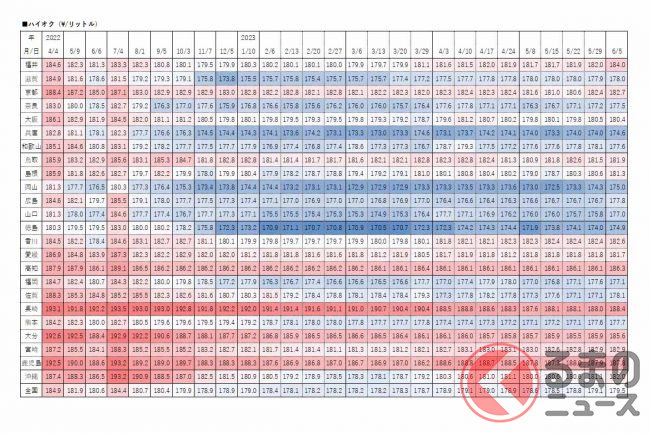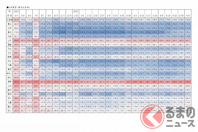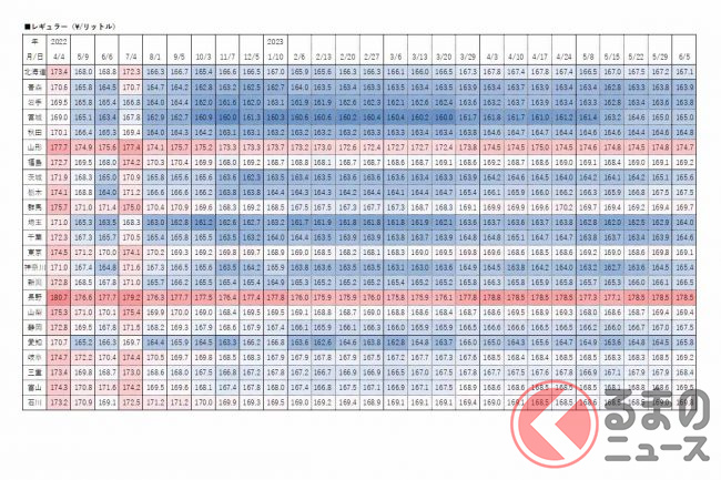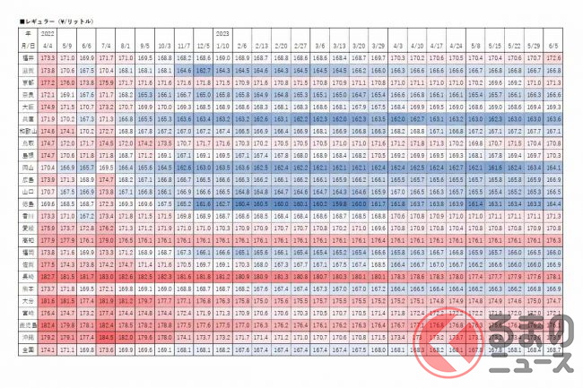 経済産業省資源エネルギー庁は2023年6月7日、レギュラーガソリンの5日時点の店頭小売価格(消費税込)を発表しました。