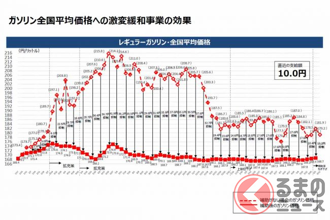 経産省によると、補助金がない場合のレギュラーガソリンの全国平均小売価格は、6月12日時点で179.2円になると見ています。
