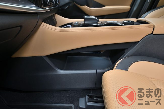 コンソール部分は宙に浮かせたブリッジ構造を採用。ラージサイズのカップホルダーが設置されたほか、コンソール下にはティッシュボックスやひざ掛けなどが収納できる機能的なものです。