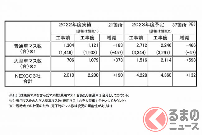 NEXCO東日本・NEXCO中日本・NEXCO西日本の3社は2023年6月7日、高速道路の休憩施設(SA・PA)で進めている大型車駐車マスの2023年度の拡充計画を発表しました。