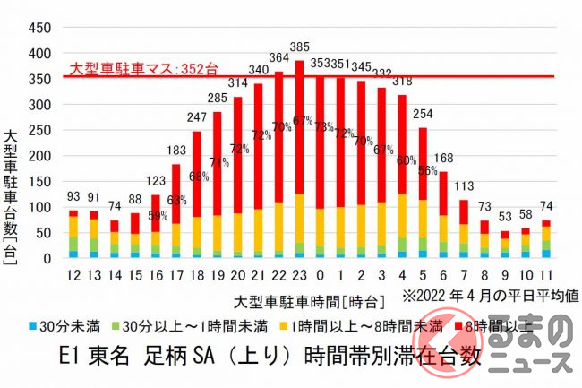 東名高速上りの足柄SA(静岡県御殿場市)では、平日夜間は8時間以上の長時間駐車が約6割を占めており、大型車マス不足の原因の一つになっているといいます。