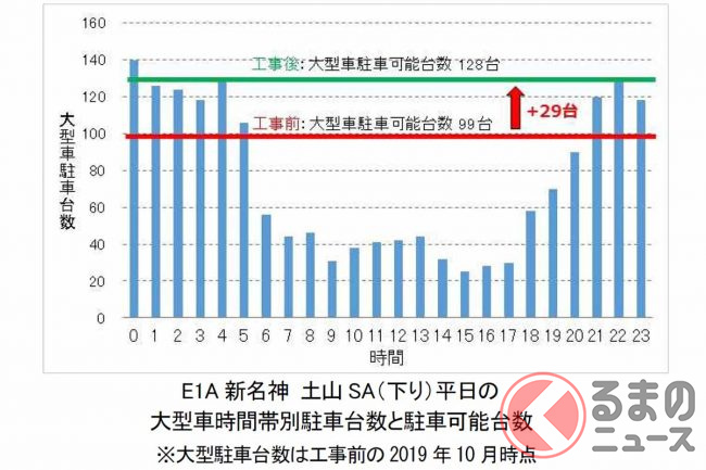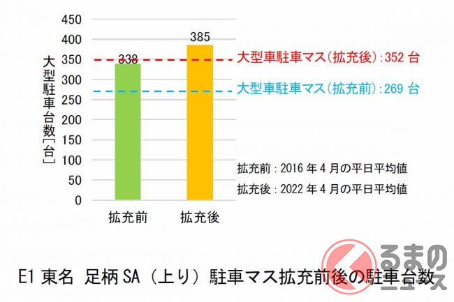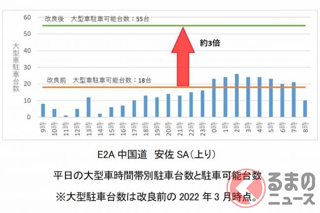 2022年度は全国21か所のSA・PAで、大型車マス373台の拡充が完了したといいます。