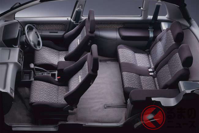 1991年2月に登場した初代RVRは、一見するとハイトワゴン風のスタイルをもっていましたが、運転席側は1ドア、助手席側はリアにスライドドアを備えたワンツードアとなっており、広い室内を贅沢に使用した2列シート仕様となっていた点も特徴でした。
