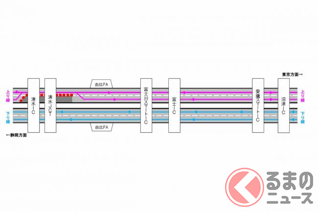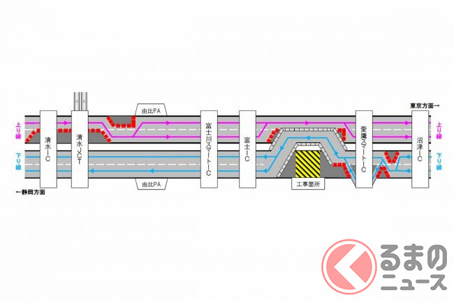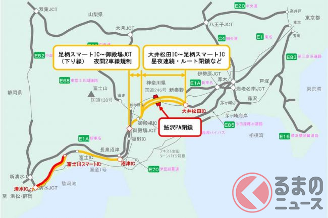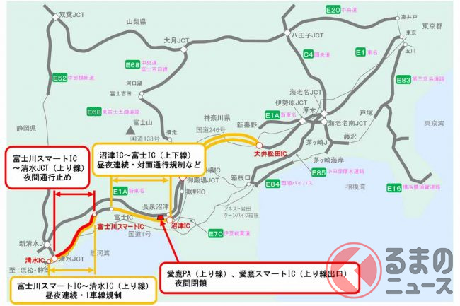 東名「1車線化」「ルート閉鎖」で最長25kmの渋滞予測 大井松田~御殿場で9月から半年間改修工事