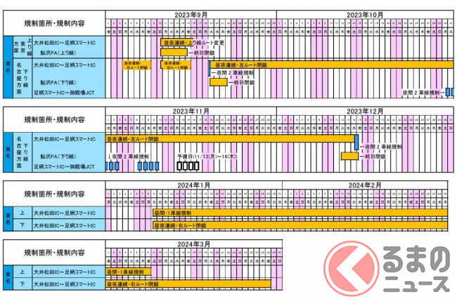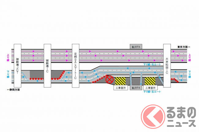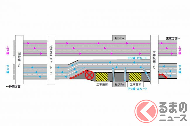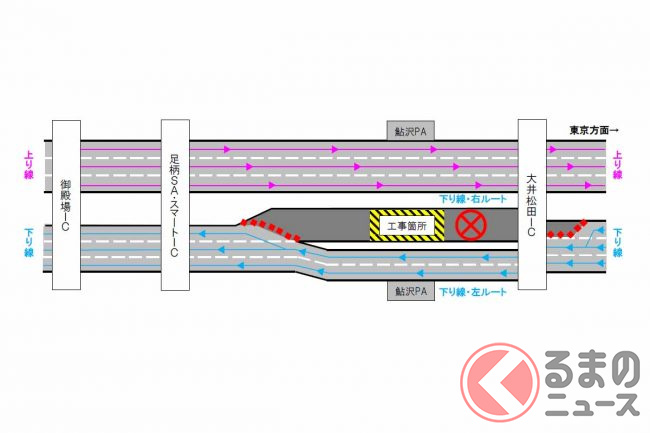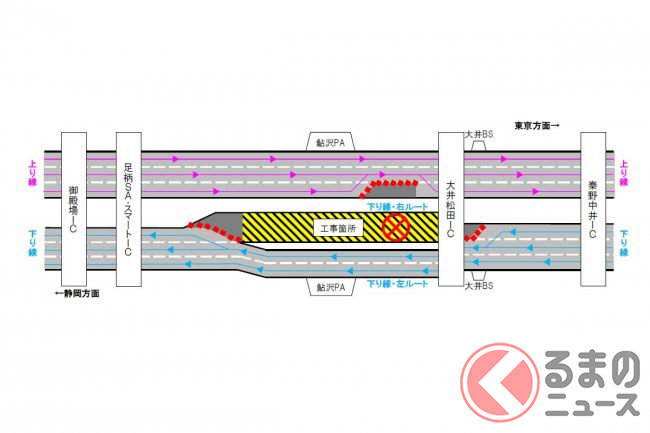 期間中、大井松田IC~足柄SA間で、下り右ルート、上り、下り左ルートの順にリニューアル工事が行われます。