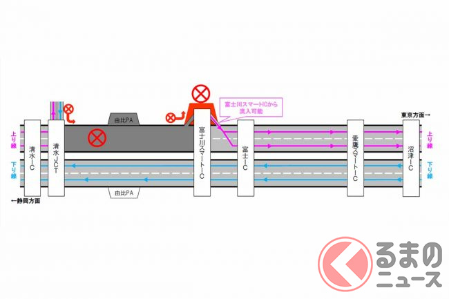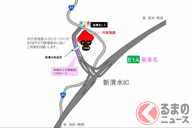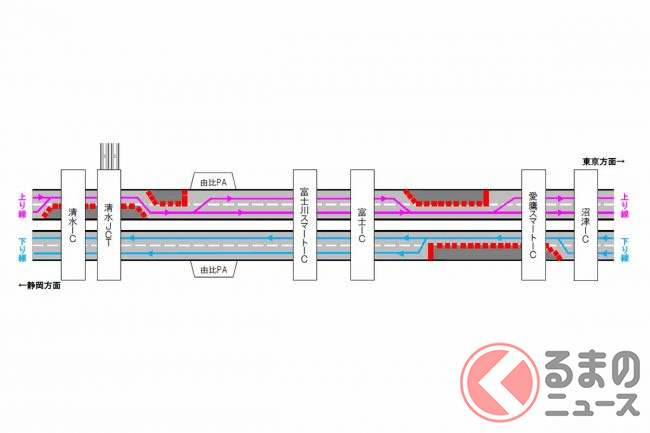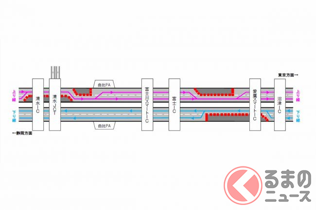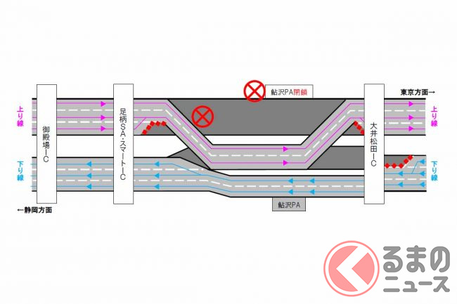 このとき、ルート閉鎖や車線規制を実施するとともに、上り3車線を閉鎖して下り右ルートを上り2車線として使うとき(9月11~15日)は、途中にある上り鮎沢PAも閉鎖されます。下り鮎沢PAも9月と12月の一部期間に閉鎖が計画されています。