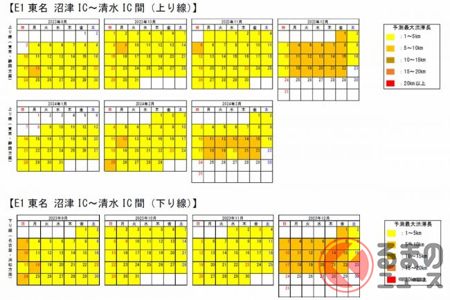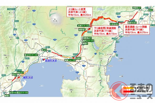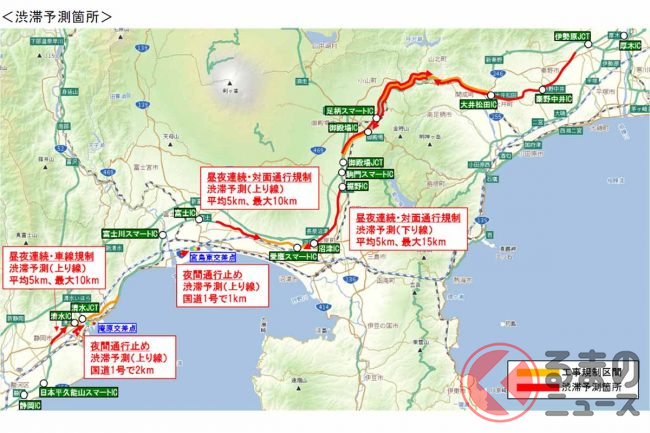また、10月30日~11月10日の月~木曜夜間(各日22時~翌6時、8夜間)は、下り御殿場IC付近で走行できる車線が3車線から1車線に減ります。このとき長さ15km、通過に2時間20分以上の激しい渋滞が予想されています。