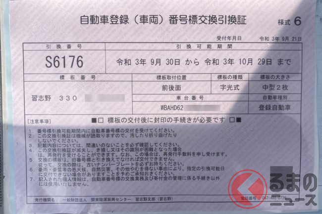 入金確認後、だいたい5~7日ほどで交付可能となります。各地域の予約センターで予約済証を受領し、運輸支局(軽乗用車では軽自動車検査協会)の事務所で登録・届出申請を行い、再び予約センターでナンバープレートが交付されるという流れです。