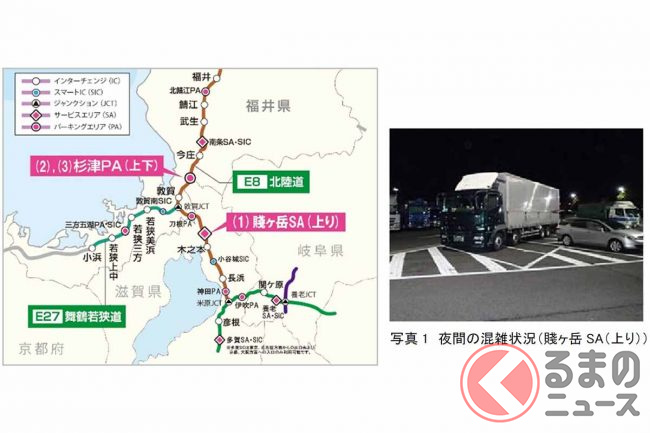 NEXCO中日本金沢支社は2023年6月13日、北陸道の賤ヶ岳SA(上り)と杉津PA(上下)で、駐車マスを増設すると発表しました。