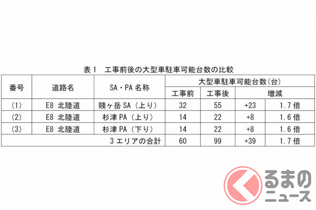 「駐車マス増設」北陸道も着手! 3か所のSA・PAでスタート 敷地そのままに大型車は約1.7倍