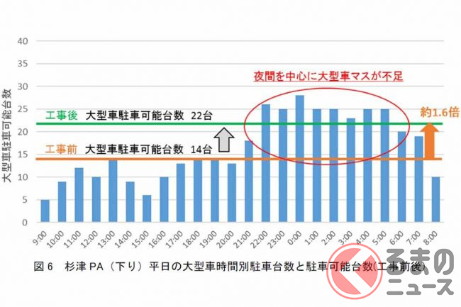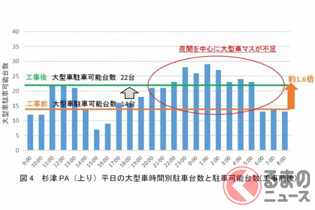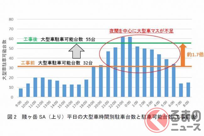 高速道路のSAやPAでは、平日の夜間を中心に大型車の駐車マスが不足しています。