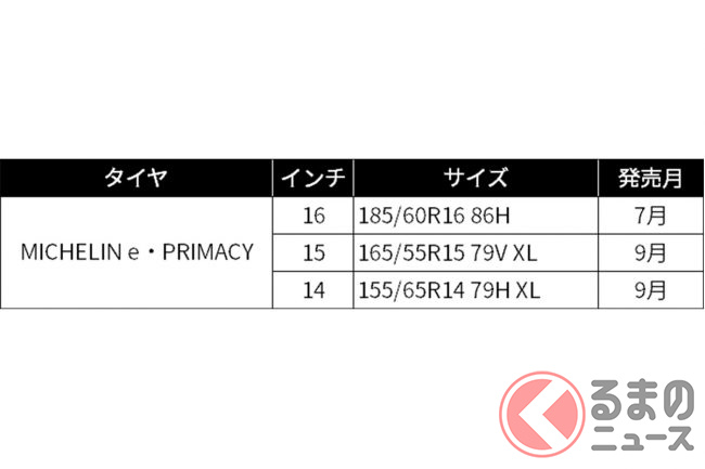 ミシュランは、プレミアムコンフォートタイヤ「MICHELIN e・PRIMACY」に新サイズを追加し、順次発売すると発表しました。