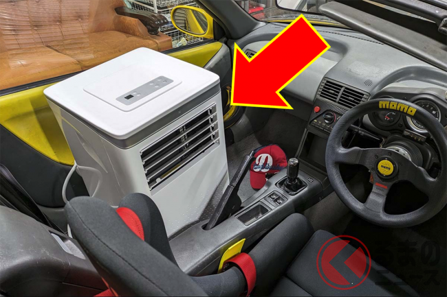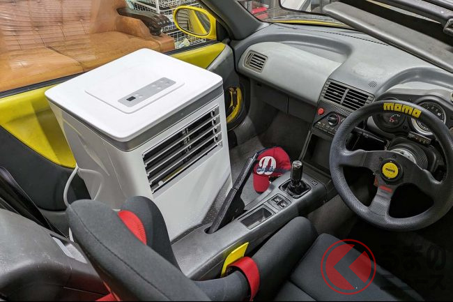 写真にはソウヤさんの愛車であるホンダ「ビート」が写っていますが、車内の助手席には直方体のスポットクーラーが設置されています。