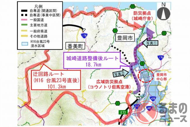 しかし、円山川は度々氾濫を起こしており、2004年の台風23号のときはこれらの県道や線路も浸水。豊岡市内で円山川を渡る国道178号(現道)も、約57時間にわたり通行止めを余儀なくされました。