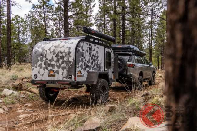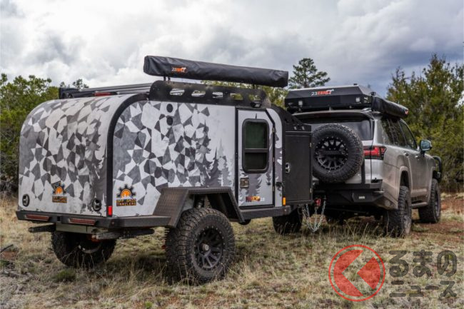 道なき道を走ることが前提なので、オフロードタイヤとリフトアップは常套手段です。また、ルーフトップテントあるいはキャンピングトレーラーなど野営するための設備を採用します。